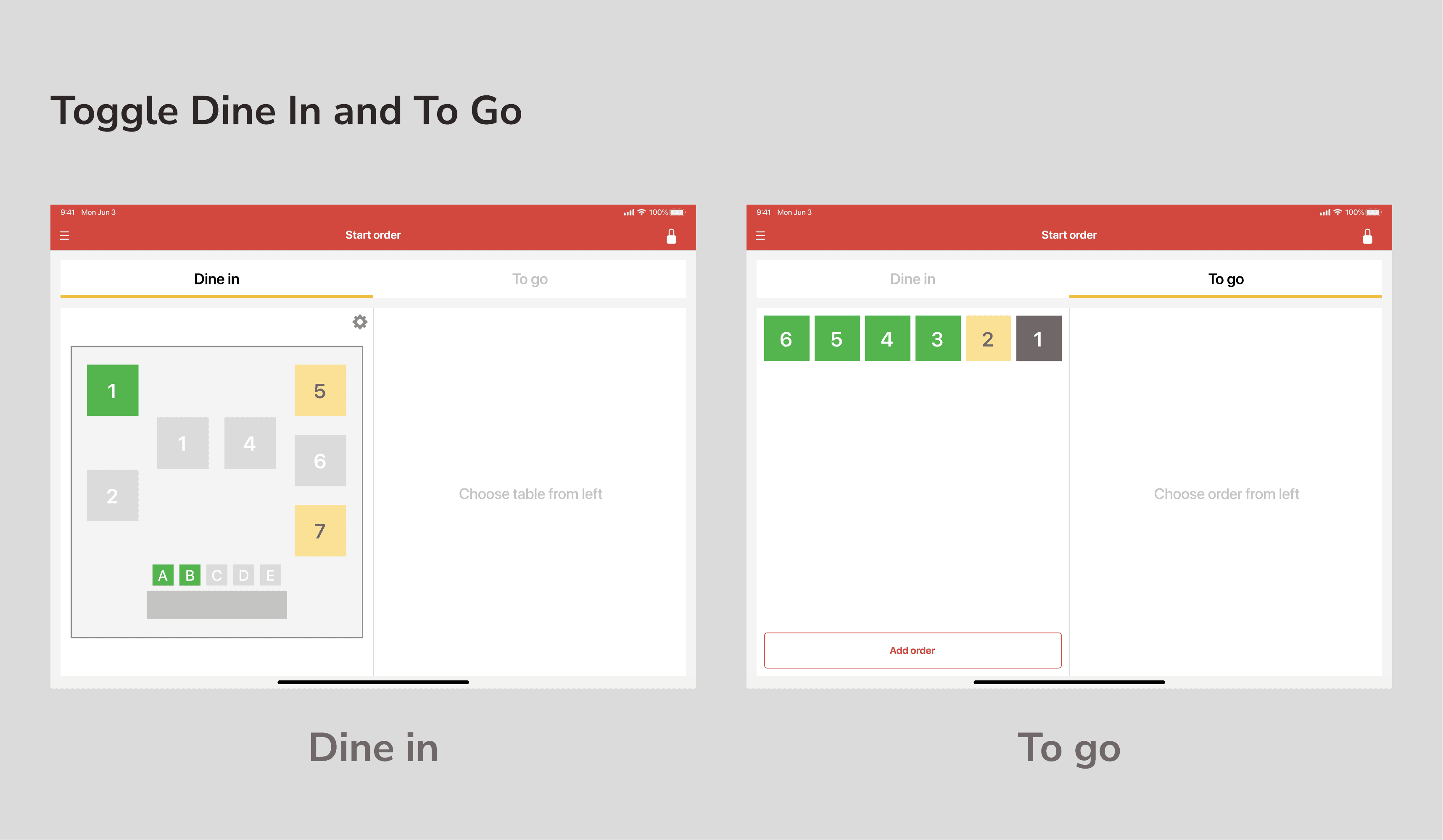 This app offers managing multiple orders for both dine-in and takeout. Staff can switch dine-in and takeout by tapping tabs.