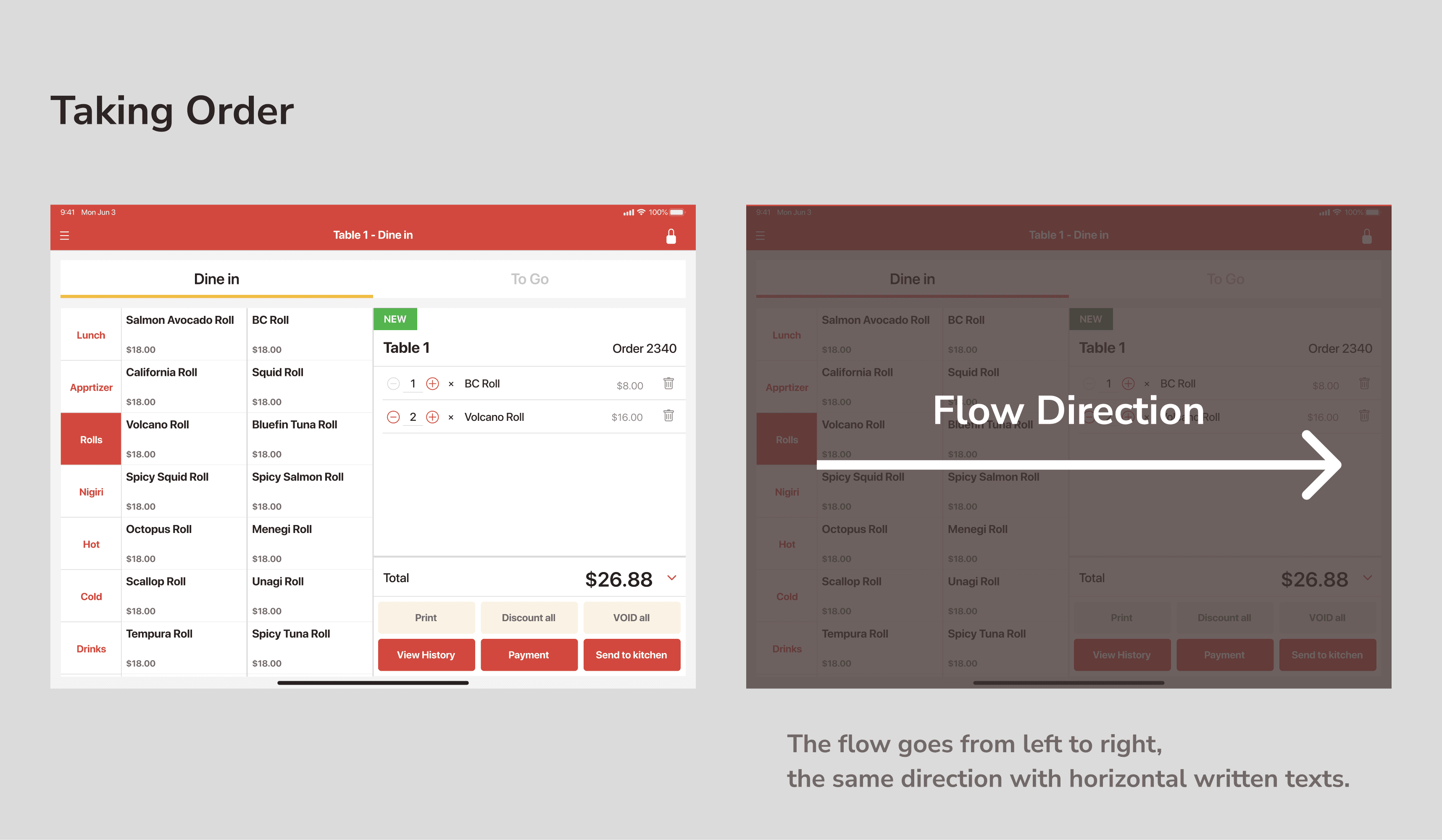 In this UI, the menu is filtered into the horizontal reading direction (from left to right), from choosing a category to editing or customizing an order.