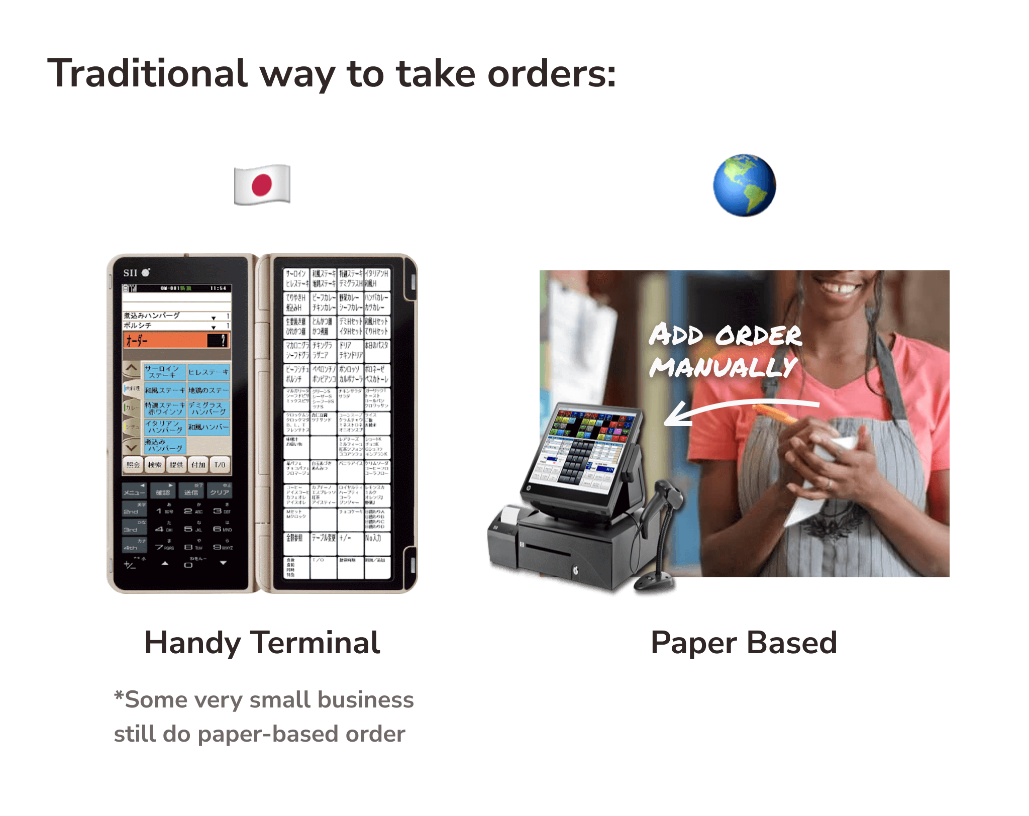 💡Tip: Although some portable POS systems (called "Handy Terminal" or "Handy") are available in some restaurant chains in Japan, There are still a lot of businesses that manage orders by writing on paper - especially outside Japan.