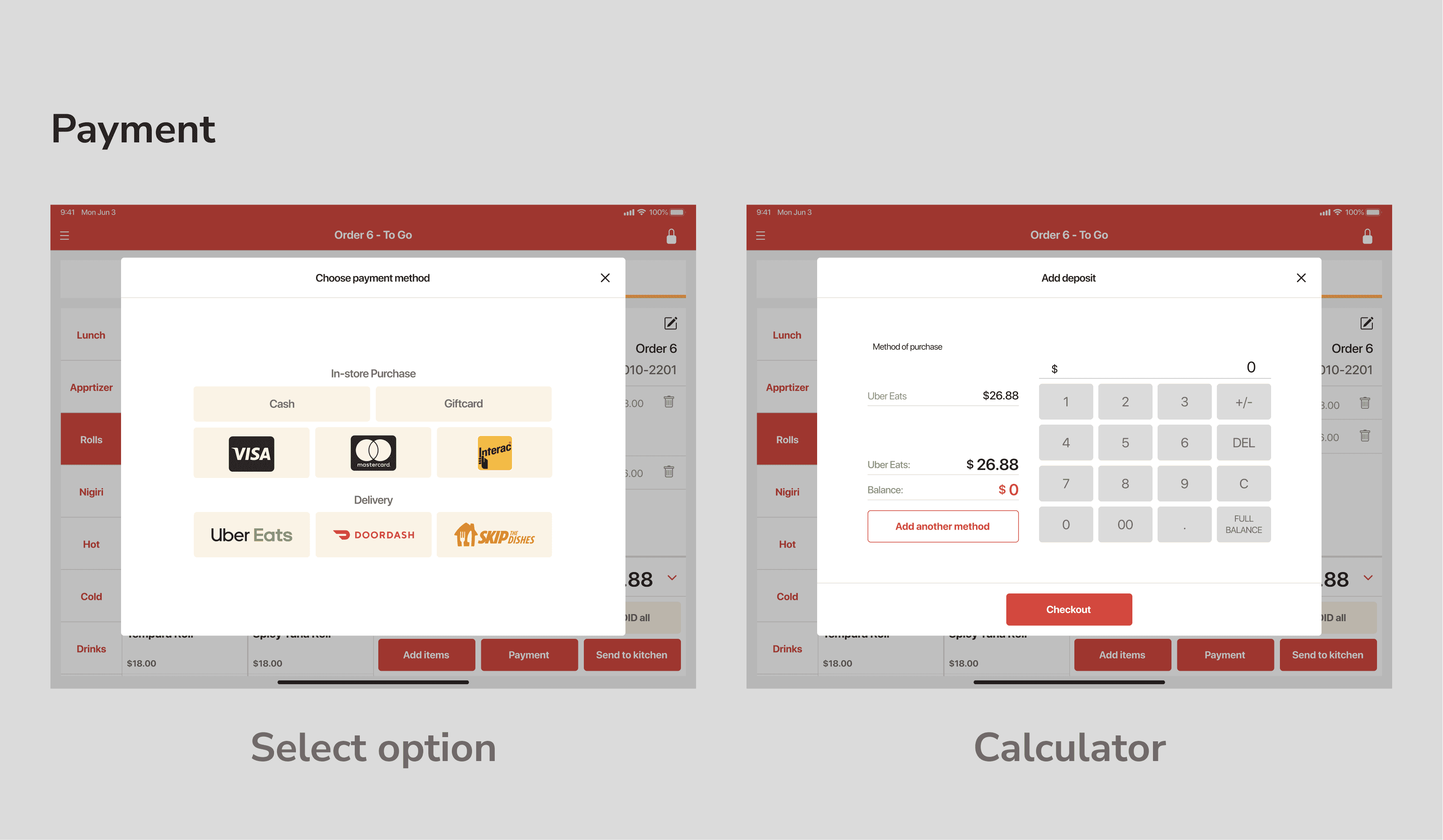 Staff can process payment when they tapped the "Payment" button. For the dine-in, we offer transactions with cash, credit/debit card, or vouchers such as gift cards, and delivery services such as UberEats, DoorDash, or Skip the Dishes.