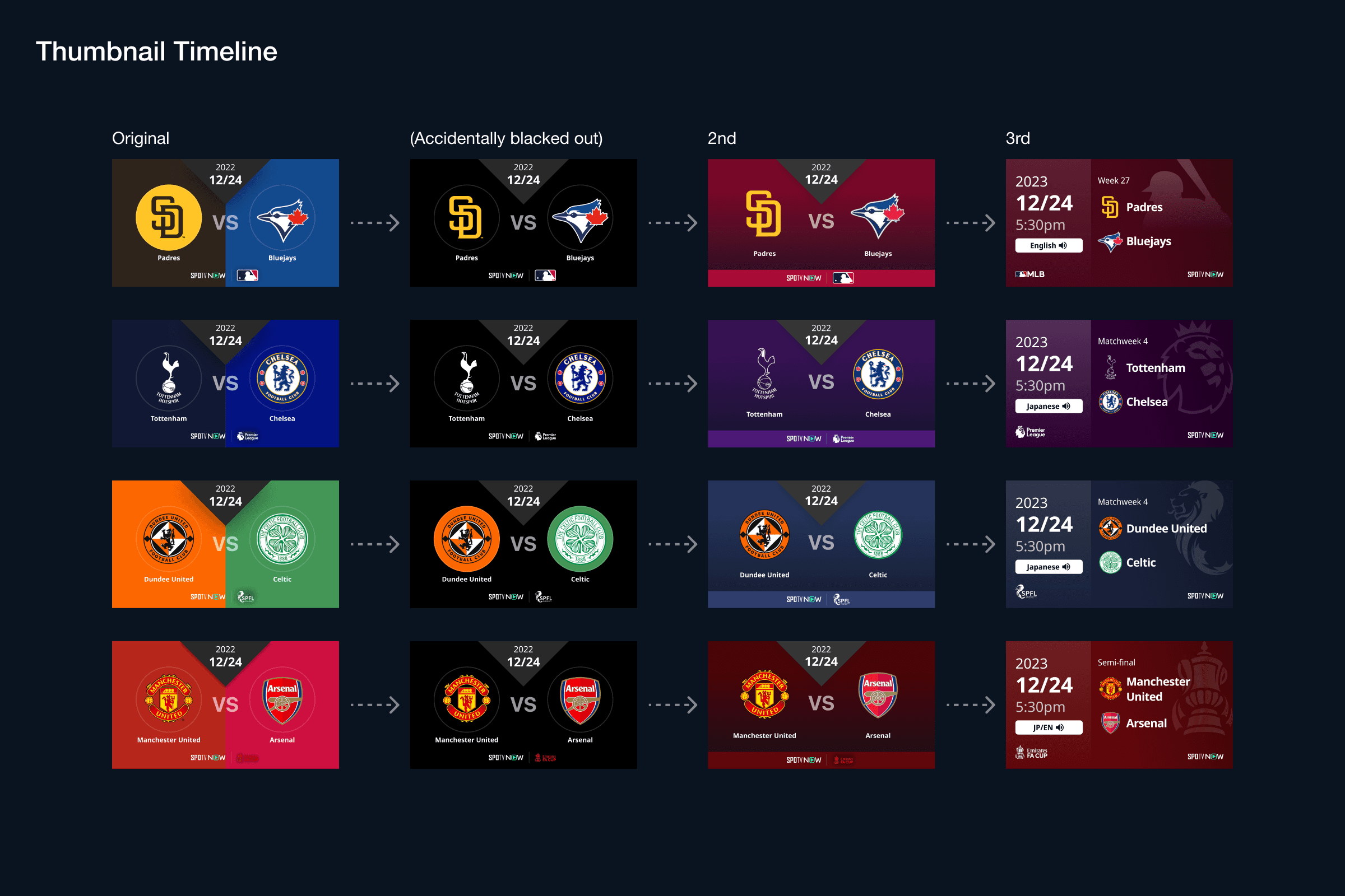 Since the thumbnails on SPOTV already exist, firstly I copied the idea to inherit their theory to introduce SPOTV properly. However, since there were gaps in theory between SPOTV and U-NEXT, I modified it by researching match game thumbnails for soccer, baseball, and ice hockey in particular on the internet.
